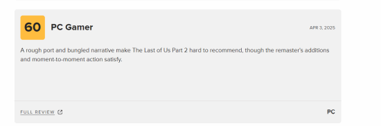 而给出中评的PC gamer则认为,虽然重制版新增内容令人满意,但仍然存在移植问题。再加上拙劣的叙事,让《最后生还者2》很难被推荐。