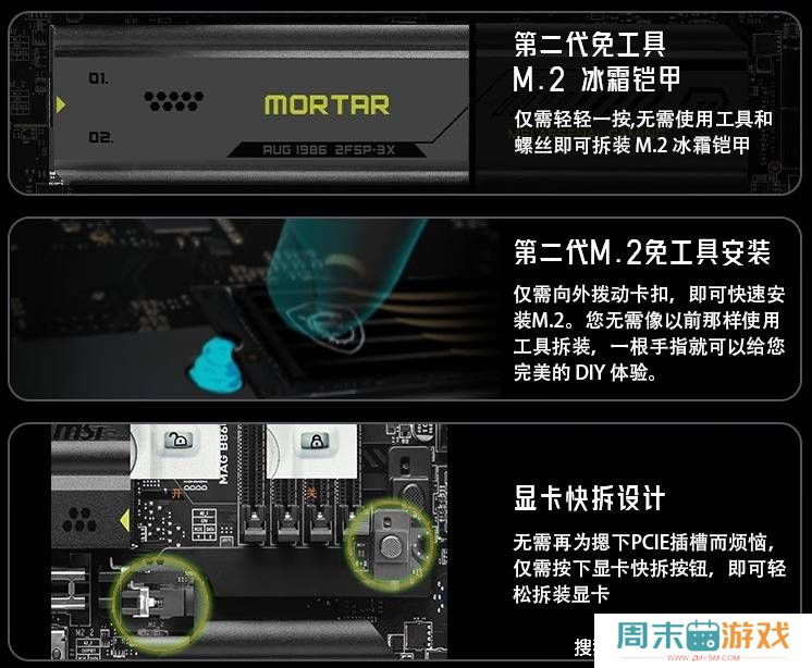 在人性化设计方面,MAG B850M MORTAR WIFI迫击炮主板同样不遗余力。微星第二代M.2免工具快装设计,让玩家无需螺丝刀即可一键锁定PCIe 5.0 SSD。而显卡快拆按钮的加入,则让拆卸显卡变得更加轻松,有效保护了硬件安全。