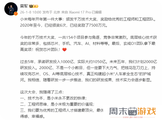 雷军:小米开年第一大事:颁奖 已奖励7500万元